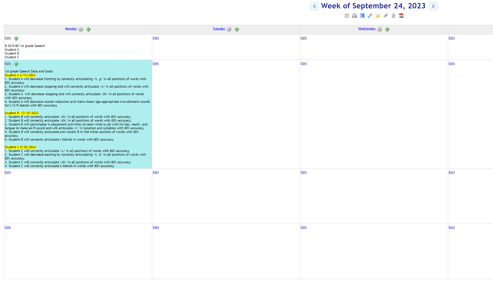 Then you put your daily schedule with times and student names into one of the first weeks of the year, skipping a box after every group for data collection. The schedule/planning boxes you are going to save WEEKLY for the first time that you set up your schedule. When you do this, you will put the schedule on every day for the entire year with one click. So when you go to the next week, your schedule is all there and ready for you to plan. I leave these schedule boxes white. When you use these boxes throughout the year, you will save them as "This entry should appear ONCE" so that it is only the therapy plan you used on that one day and it does not go forward to your whole year.